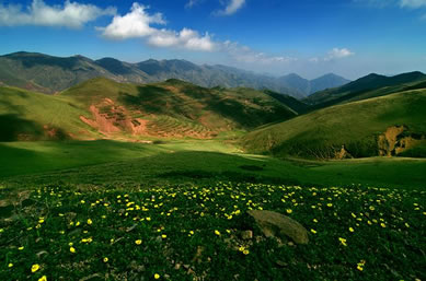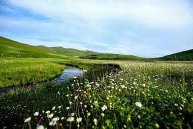 草甸、鮮花、小溪、藍天、白云、羊群,構成了一幅優(yōu)美迷人的圖畫。
