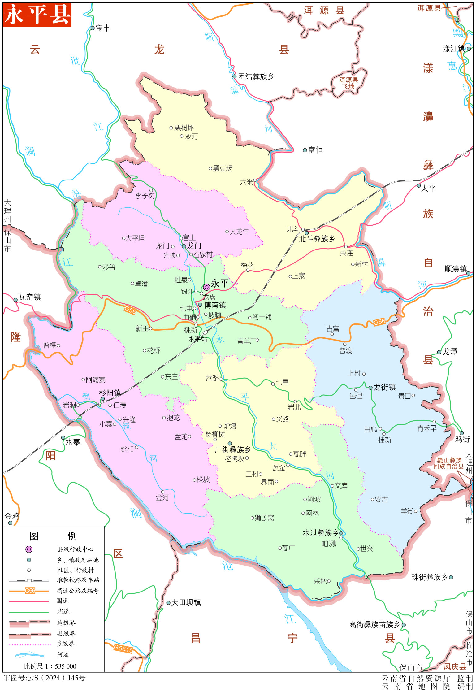 位置 永平縣位于大理白族自治州西部,東鄰漾濞彝族自治縣和巍山彝族回族自治縣,南接昌寧縣,西隔瀾滄江與保山市分治,北與云龍縣山水相連。東西最大橫距64.5千米,南北最大縱距77千米,永平縣土地總面積2884平方千米。