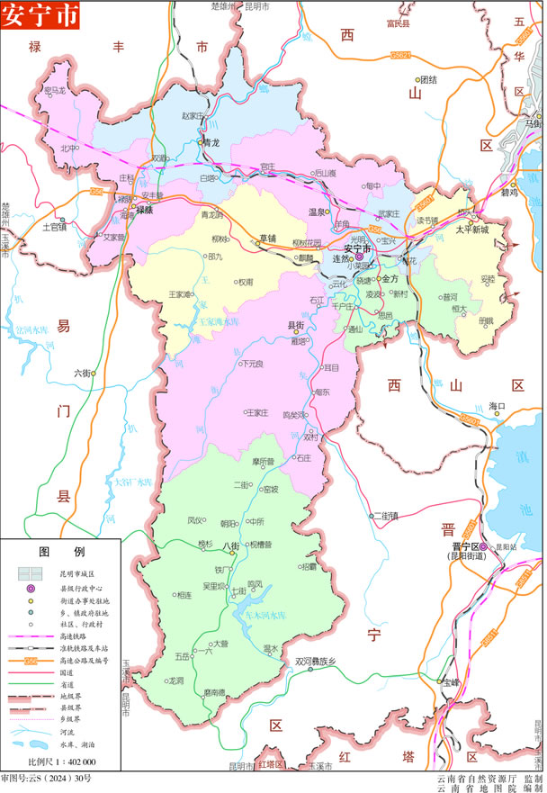 安寧市轄9個(gè)街道:連然街道、溫泉街道、太平新城街道、青龍街道、草鋪街道、祿脿街道、八街街道、縣街街道、金方街道
