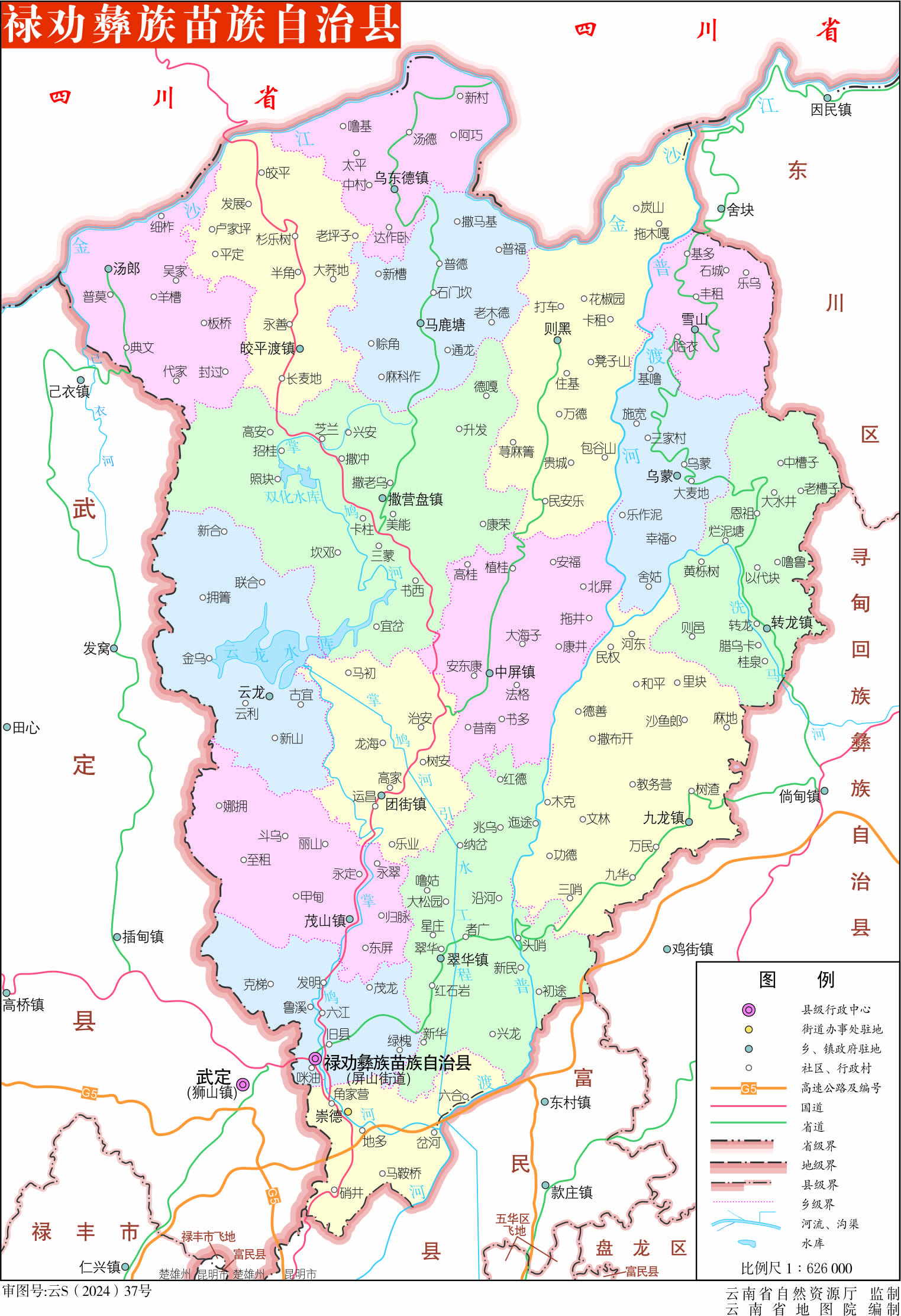 鎮(zhèn):撒營盤鎮(zhèn)、轉龍鎮(zhèn)、茂山鎮(zhèn)、團街鎮(zhèn)、中屏鎮(zhèn)、皎平渡鎮(zhèn)、烏東德鎮(zhèn)、翠華鎮(zhèn)、九龍鎮(zhèn)