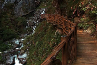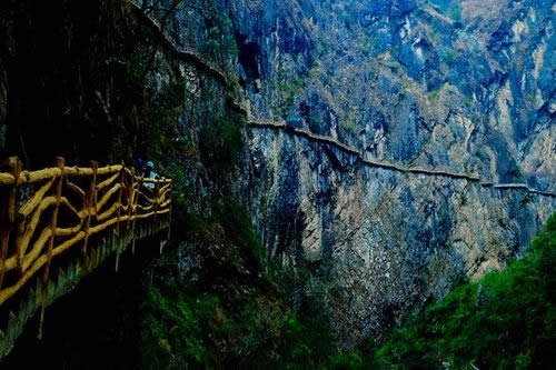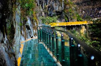 ②高空棧道探險(xiǎn)游路:福緣橋——龍王廟——天開(kāi)石門(mén)——鶴峰亭——五道水服務(wù)區(qū)——高空玻璃棧道——七彩玻璃觀景平臺(tái)——高空棧道——七道水彩虹橋——七道水瀑布——野生芭蕉林——百步天梯——萬(wàn)獸谷——枯木要塞。全長(zhǎng)3500米,