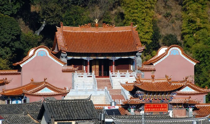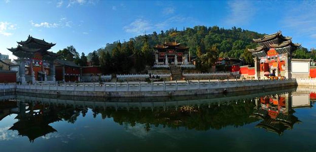 始建于元末,歷經明清歷代重建重修,現(xiàn)為清初和清末的建筑。寺中保存下一堂(六扇)木雕槅門,出自清末滇南木雕藝術家高應美之手,槅子門中的構圖、布局、人物造型,被省內外學者稱之為“海內第一木雕”。三圣宮布局為三進式兩院,由大殿、后東西兩廂、中殿、前東西兩廂、前殿(重檐)及前、中、后的六個躲間組成,外設圍墻并呈船形,墻外雙溪環(huán)繞而過。1993年被省政府公布為“第四批文物保護單位”。