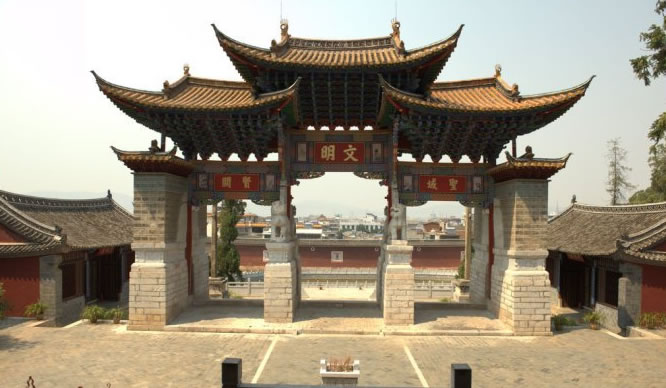 位于通?h城南隅、座落于秀山之麓,南北向。為中軸線分幢迭起單體組合式古建筑群,由紅墻(長65米、厚1.9米、高8米)泮池、文明坊、忠烈祠、節(jié)孝祠、大城門、鄉(xiāng)賢、名宦祠、東廡、西廡、大城殿、鐘鼓樓、崇圣祠、尊經閣組成,總占地1.2萬平方米。通海文廟始建于元代,于明萬歷遷建今址,現(xiàn)存建筑為清初康熙、雍正之物。清朝時期,在通海廟學中曾經培養(yǎng)出朱嶟(禮部尚書),公孫翰林的董玘、董健,有名書法家闞禎兆等。通海文廟于1998年被省政府公布為“第五批文物保護單位”。