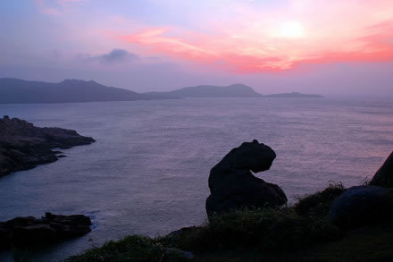 慈航普渡的觀世音菩薩在南麂列島定格、凝固成了高20米的天然巨像,它身披風(fēng)帔(俗稱“觀音兜”),垂著兩袖,眉目宛然,專注地向東海第面凝視。然而這觀音巖腳下全是刀劍般的礁石,潮來時淹滿水,更像是泥犁地獄了。而在不遠(yuǎn)的1.5米外,有5支石柱聳立,其中最高的柱頂,酷似調(diào)皮搗亂和小猴子。它在觀音菩薩面前,有所窺伺,又有所祈求。更令人驚奇的是,景隨步移,若南行數(shù)十步,從另一個角度望,慈目的妙齡觀音卻突然變成了老態(tài)龍鐘的南極仙翁,故人們又稱之“壽星巖”。移步換形不僅平尜游人興趣,而且從“雙面人”身上也不有同感悟。