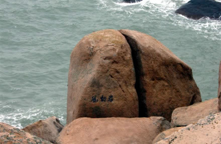 能以人力或風(fēng)力推動而搖擺的大巖石,在各地勻有發(fā)現(xiàn)。南麂三盤尾石門旁的風(fēng)動巖卻別有情趣。此石高約5.5米,直徑4米,形如銅鼓,卻裂成兩瓣,一瓣是“靜如處子”分外端莊;另一瓣,凡遇上5級以上大風(fēng),便自行搖動,可謂“動似脫兔”,還以發(fā)出悅耳聲響,宛如海底傳來的進(jìn)軍號角。倘若無風(fēng)時,那只得勞駕游客,憑力氣去推、去搖。面對風(fēng)動巖了,聯(lián)想起佛教中關(guān)于“風(fēng)動也,情動也,見仁者自己心動”的“因緣和合”典故,似乎明白了自然景觀中也充滿生活哲理。此巖其自身根基不穩(wěn),加上風(fēng)的外力,便顯得搖擺不定。