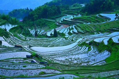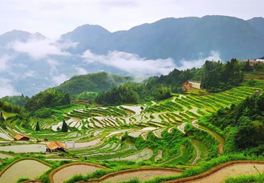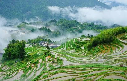 乍看似無序的曲線,在眩目的平臺狂歡,扭動的身姿沒有雷同的,田塊的形狀沒有相似的,草色花色水色天色沒有凝固的,景隨步移沒有不變的,泥房炊煙、耕牛犁田、牧童短笛沒有靜止的……,畬漢兩族農(nóng)人,千年生命接力,用一種筑田岸、鏟田坎的古老技術(shù),向大自然求愛,創(chuàng)造云和古老的童話世界。這就是云和梯田——中國最美梯田。
