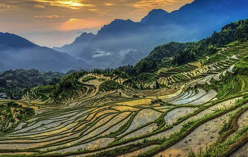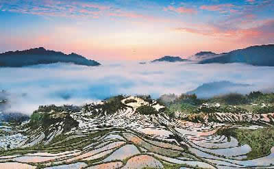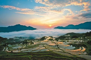 云和梯田如同一位四季美人:春穿花衫,水滿層疇:夏披綠紗,禾海滾浪;秋著紅裳,金穗漫山;冬裹銀裘,雪毯素裝。年復一年,山花不敗,鳴禽百囀,流泉不竭。日復一日,從山嵐染成金玫瑰,到白云變幻成蒼狗,一幕幕展現(xiàn)大自然造型和著色的奇詭。