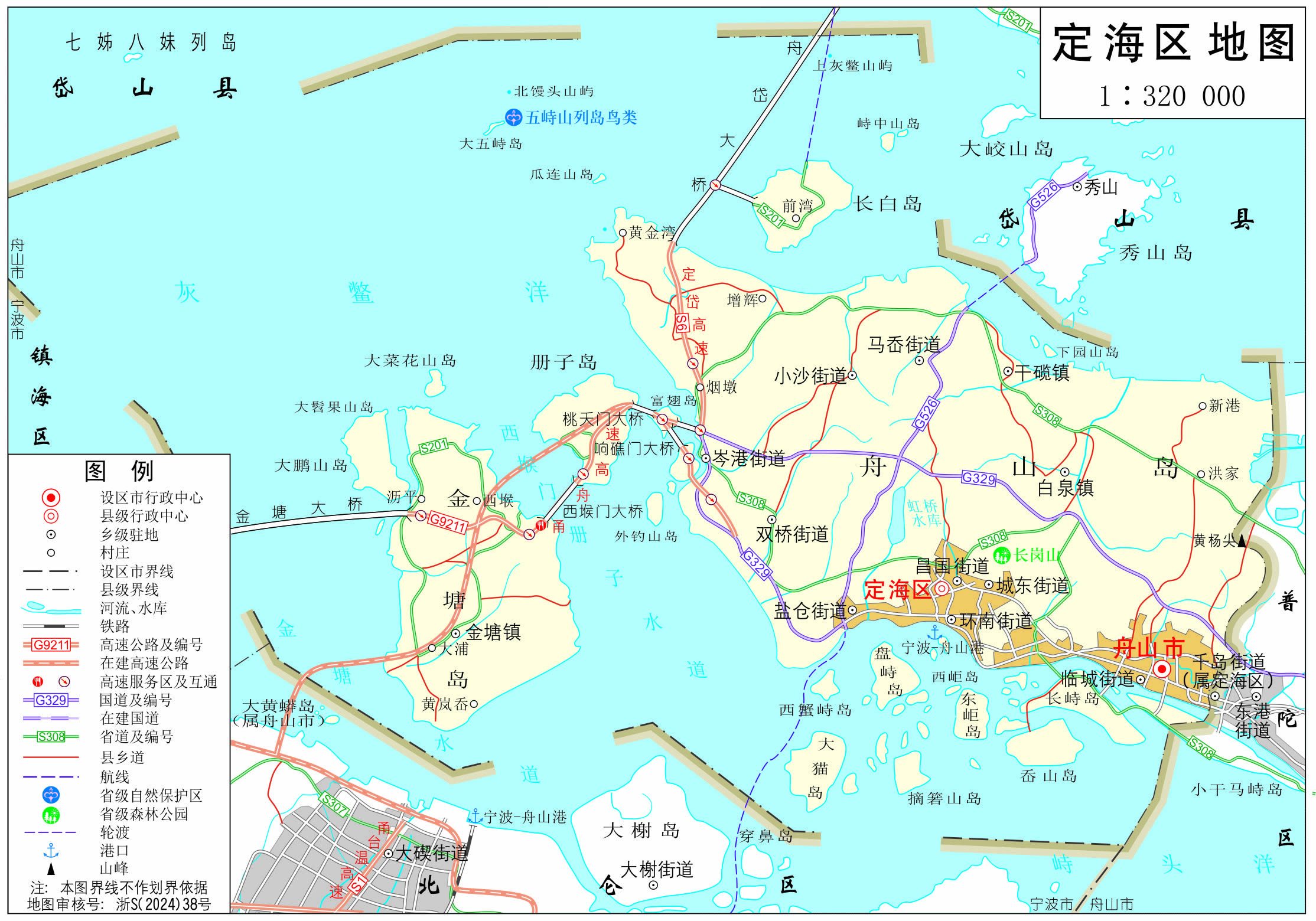鎮(zhèn):雙橋鎮(zhèn)、小沙鎮(zhèn)、金塘鎮(zhèn)、白泉鎮(zhèn)、岑港鎮(zhèn)、馬岙鎮(zhèn)、干纜鎮(zhèn)